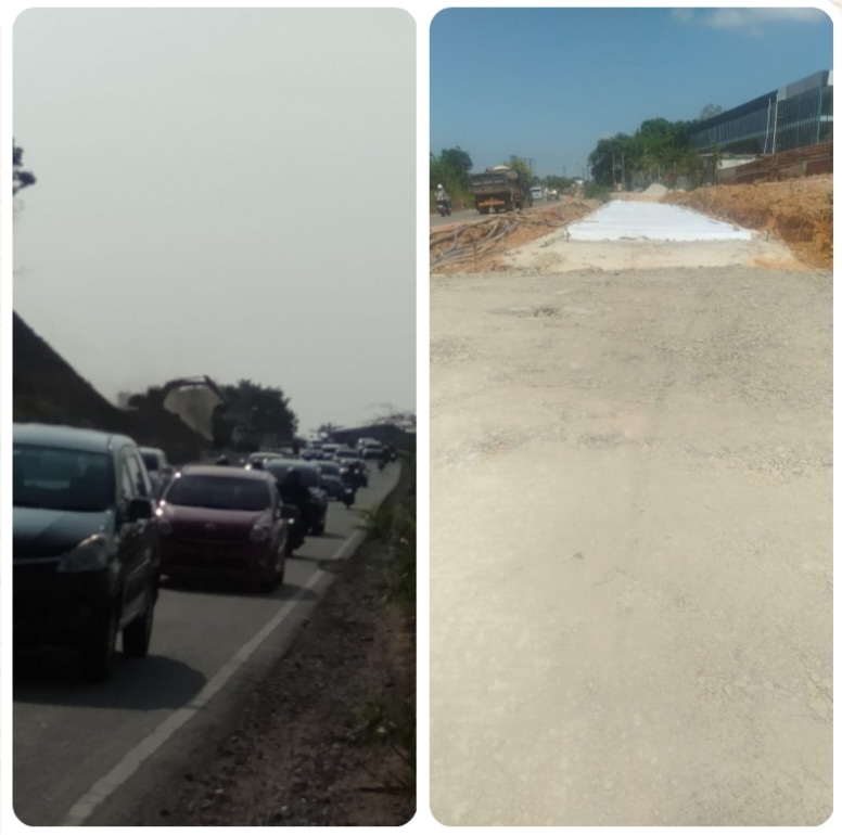 BATAM | MNI ■ Pengerjaan peningkatan jalan gajah Mada landing point fly over Simpang laluan Madani, diduga gunakan material jenis batu cadas muda untuk penimbunan.